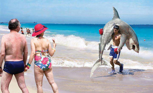 Samedi 6 juin, Clément Jean a donc de nouveau décroché son téléphone et pris son clavier. Pour appeler BFMTV et adresser un long mail à Julien Mielcarek... Cherchez l'erreur ! Aucune réponse à ce jour, ni modification sur le site... Demain peut-être ? En attendant, mieux vaut en rire qu'en pleurer avec cette plaisanterie glanée sur la Toile où l'on voit très bien un boxeur ramenant un requin sur ses épaules !