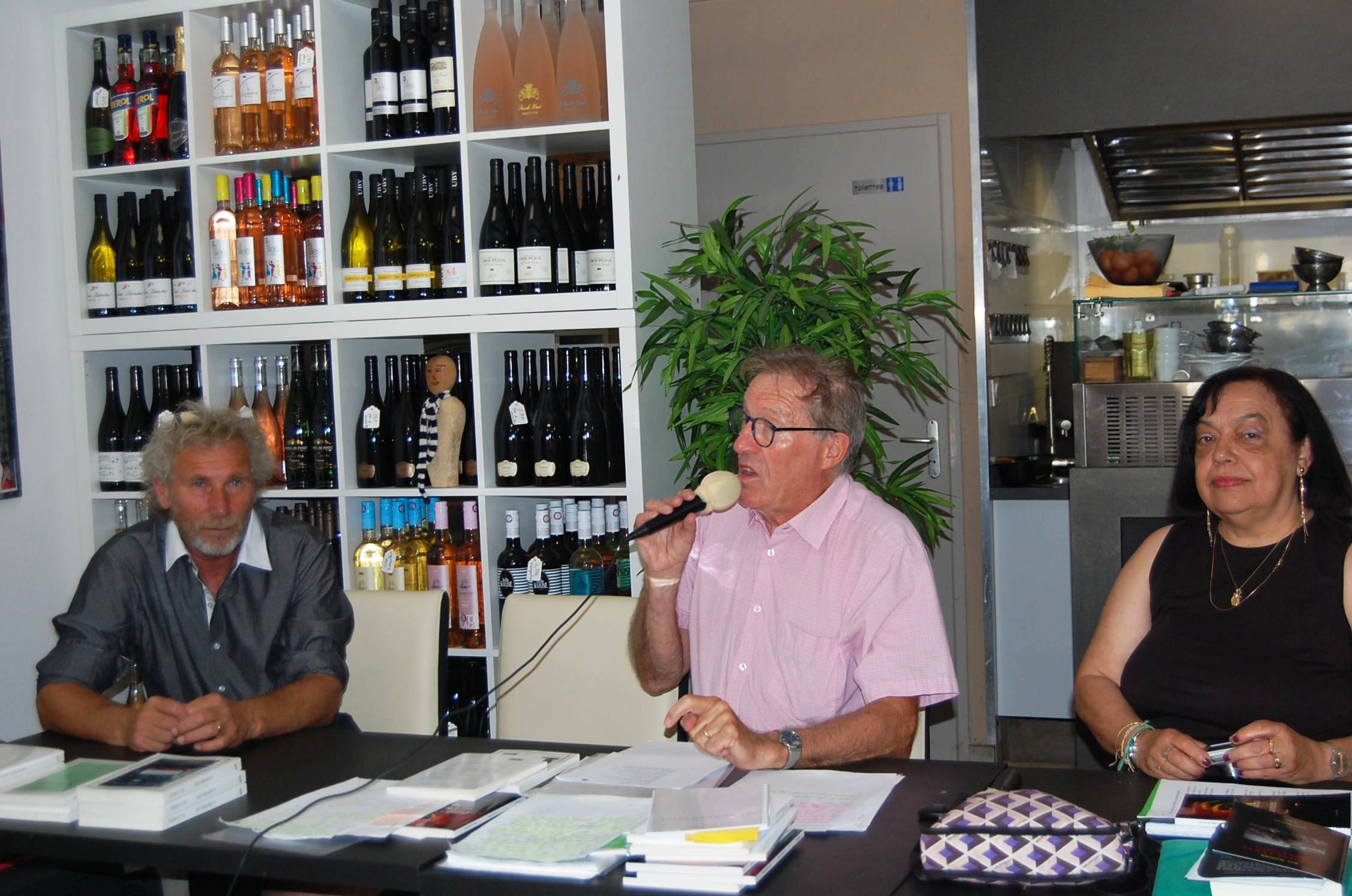 Très estival, ce 69è Musc’art à Côté Mer, ce 5 juillet. Soleil, ciel bleu, touristes, tenues légères, sourires, terrasse animée….nous étions vraiment en juillet! Le public de Musc’art s’était lui aussi allégé en nombre mais la vingtaine était là quand même. Pour accueillir, avec Angela Mamier, les deux invités du jour: Jean-Marie Leclercq, un poète, venu de Montpellier, avec son dernier et 10è recueil, «Paroles voilées sur l’homme», et Eric Gohier, l’un des piliers des Auteurs au Soleil, de Frontignan, qui lance son dernier roman, «La valse lente des corps».
