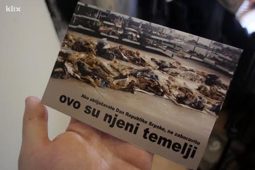 Les cartes présentent une photo des cadavres et des restes humains avec pour légende :"Si vous fêtez le Jour de la République Serbe, ce sont ses fondements".