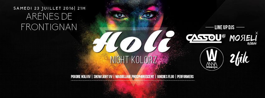"Viens vivre une expérience inédite, ta première Holi Night Kolorz", lance Cassou, DJ agitateur de foule, de sons et de lumières sur sa page Facebook : "De la poudre Holi UV, un show light UV, du maquillage phosphorescent, des goodies fluo, des performers, un festival de DJs », « colore ta nuit du 23 Juillet » !