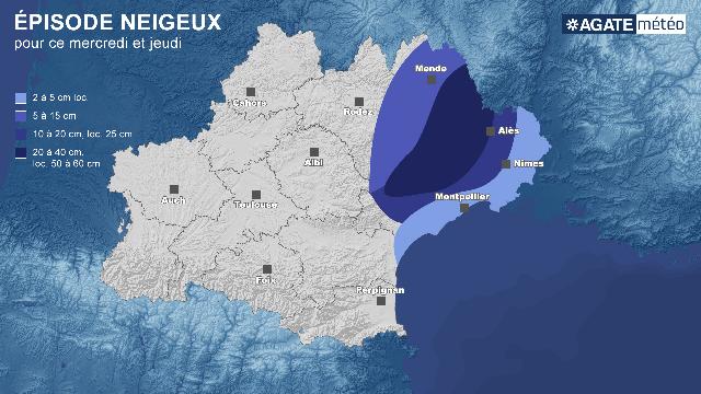 "La neige devrait tomber jusqu'aux zones littorales de l'Hérault et du Gard demain matin, en tenant probablement au sol, explique Loïc Spadafora, prévisionniste d’Agate Météo. L'après-midi, la limite pluie-neige pourrait temporairement remonter vers 100 ou 200 mètres avant qu'elle ne s'abaisse à nouveau mercredi soir, sous l'effet des précipitations qui se renforceront nettement. L'épisode se poursuivra dans la nuit de mercredi à jeudi, pour prendre fin en matinée de jeudi sur les plaines."