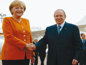 e président algérien Abdelaziz Bouteflika a reçu jeudi à Alger la chancelière allemande Angela Merkel. L'entretien a eu lieu au palais présidentiel à Alger en présence de MM. Mourad Medelci, ministre algérien des Affaires étrangères, Abdelmalek Guenaïzia, ministre délégué auprès du ministre de la Défense nationale, Chakib Khelil, ministre de l'Energie et des Mines, et Hamid Bessallah, ministre de la Poste et des Technologies de l'information et de la communication.